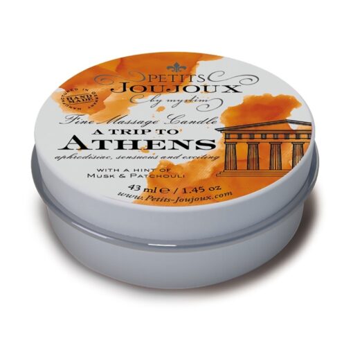 Petits Joujoux: massagekaars A Trip To Athens musk en patchouli Maak jullie spannende avond er één om niet snel te vergeten met de heerlijke massagekaars van Petit Joujoux, A Trip To Athens. Door de zoete en aromatische geur van muskus en patchoeli wordt je kamer onmiddellijk in een zoete geursensatie ondergedompeld.